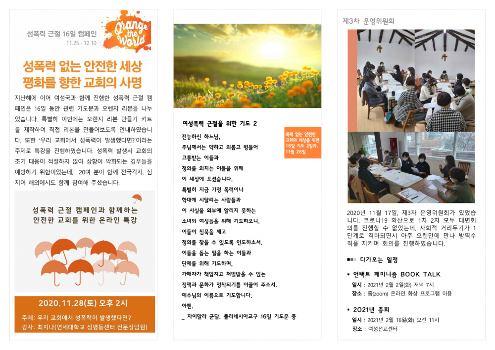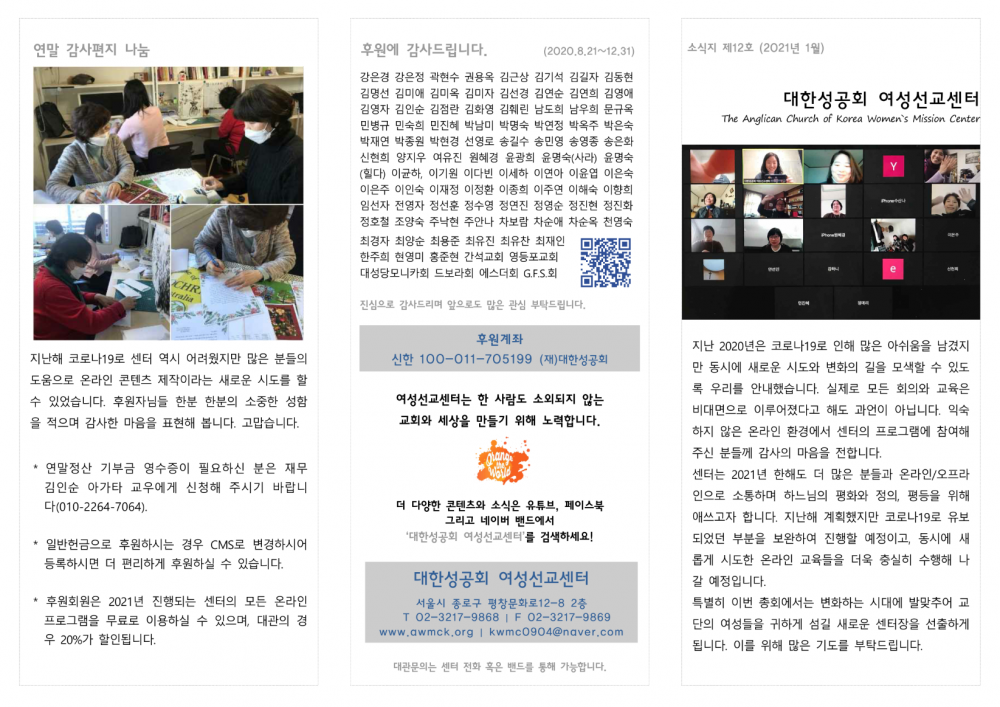 2021 1월 제12호 센터소식지 페이지 정보 작성자 AWMCK 작성일21-01-29 12:46 조회1,237회 댓글0건 관련링크 이전글 다음글 목록 본문 소식지 제12호(2021년 1월)로 인사드립니다!계속해서 많은 관심과 기도 부탁드립니다~^^ 댓글목록 등록된 댓글이 없습니다. 이전글 다음글 목록
